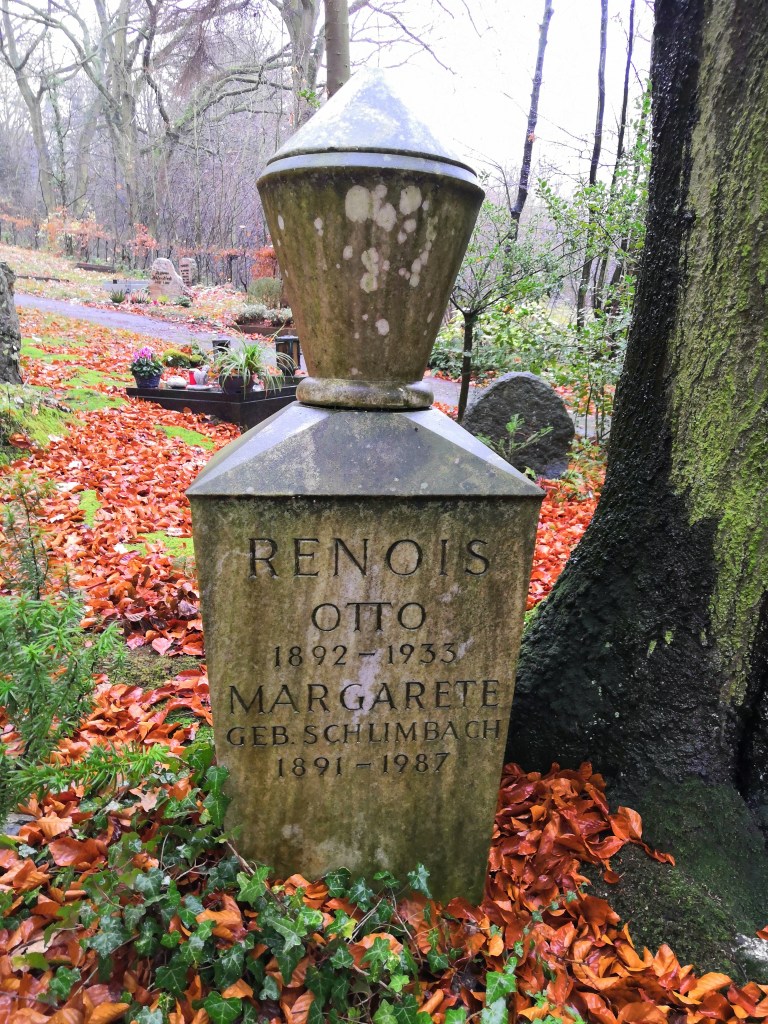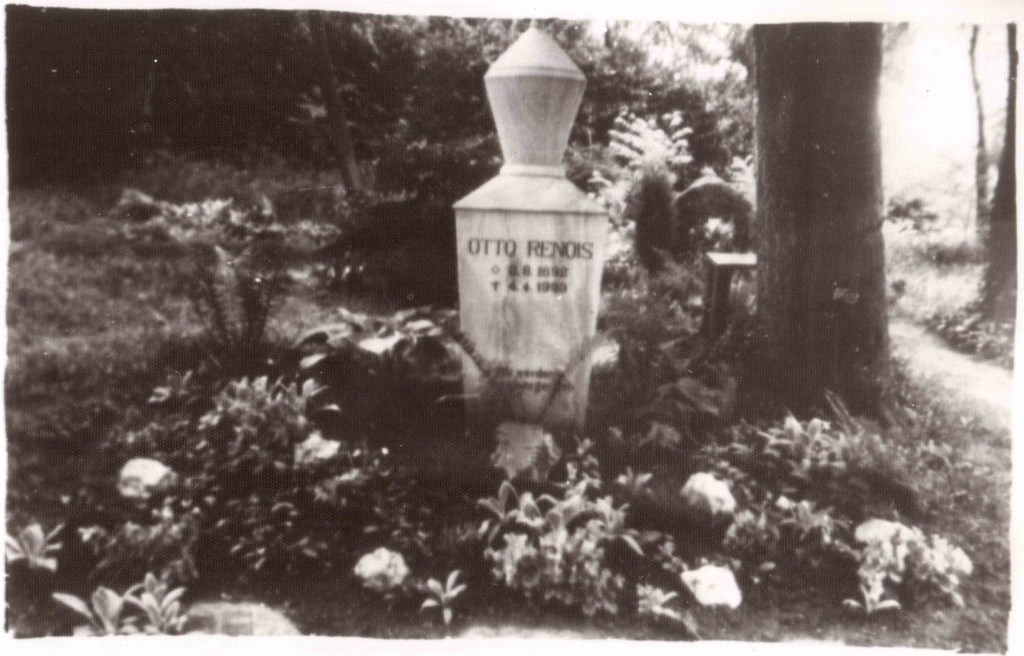 Auf dem Poppelsdorfer Friedhof haben sowohl Otto Renois als auch seine Ehefrau Margarethe (geb. Schlimbach) ihre letzte Ruhestätte gefunden. Das linke Foto zeigt sein erstes Grabmal, welches allerdings während der Haftzeit seiner Ehefrau (1935-37) beseitigt wurde, im Jahr 1940 jedoch, wie oben erwähnt, wiederhergestellt werden konnte. Noch später wurde die Grabsteininschrift leicht verändert und mit dem Namen Margarethe Renois‘ ergänzt sowie der Stein näher am Baum positioniert. In dieser Form steht das Grabmal dort bis heute.