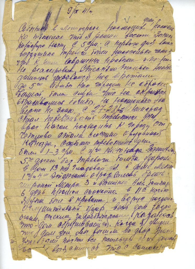 Die meisten Leningrader führen während der Blockade Tagebücher und werden so zu Chronisten des Lebens und Sterbens in der eingekesselten Stadt. So der 59-jähriger Lazar‘ Mojzhes, der am 9. September 1941 notierte: „Die Ereignisse der letzten Tage in Leningrad sind so schwerwiegend, dass ich beschloss, darüber Tagebuch zu führen; vom ersten Tag des Krieges an waren die Luftalarme so häufig, dass man sich daran gewöhnte und kaum reagierte. Nur die Notwendigkeit sich zu verstecken, schränkt einen ein…“.