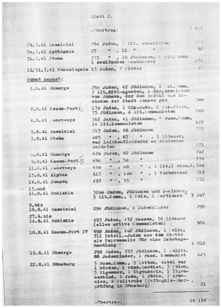 Mit welchem „Fleiß“ und „Organisiertheit“ der Massenmord vonstattenging, bezeugt der Bericht des Anführers des EK 3 Karl Jäger. Es ist eine akribische, skrupellose Tag-für-Tag-Auflistung aller in Litauen ermordeten Juden zum 1. Dezember 1941. Dieser Bericht gilt als eines der Schlüsseldokumente des Holocaust. Hinter den lakonischen Zeilen des „Jäger-Berichts“ stehen viele ergreifende Geschichten von Juden in Wilna, Paneriai, Rokiškis, in den Forts der Festung von Kaunas, allesamt Orten von Massenmorden.