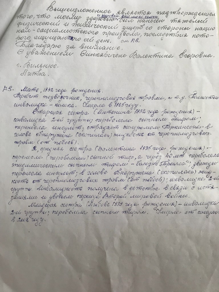 Dieser Krieg hat 27 Millionen Menschen in der Sowjetunion das Leben gekostet. In den betroffenen Gesellschaften wirkt der Schmerz, den der Krieg verursachte, bis heute nach. Es ist keine Metapher, sondern ein tatsächlicher psychischer und physischer Schmerz. Ich zitiere aus dem Brief von Valentina Egorovna Sinkevichiene, geboren 1935, die als Kind Opfer medizinischer Versuche wurde. Mit ihrer Mutter und zwei Schwestern war sie im KZ Kaunas Sehcster Fort und dann in Alytus. „Die Haft unserer Familien in nazistischen Lagern während des Zweiten Weltkrieges auf dem Gebiet Litauens ging nicht spurlos vorbei und hatte gravierende gesundheitliche Auswirkungen. Meine zwei Schwester und ich haben eine Behinderung zweiter Gruppe. Diese Jahre raubten uns die Kindheit, brachen die Psyche, haben Angst und Alpträume für das ganze Leben eingeflößt. Ich habe mich 1943 in Kaunas im sechsten Fort (KZ Nr. 336) mit dem epidemischen Fleckfieber angesteckt. Die „Prozeduren“-Versuche denen ich ausgesetzt war schufen beste Voraussetzungen dafür, dass der epidemische Fieber in meinem Organismus blieb und sich noch mal 1983 meldete – ich erkrankte an der Brill-Zinnser-Krankheit. Haben denn diese Versuche und Blut, das mir abgenommen wurde, ein Nutzen für die Wissenschaft und Gesellschaft gebracht? War es etwa umsonst? Wer entschädigt mich dafür? Es tut weh. Die KZ raubten mir die Lebensfreude – ich konnte nicht Mutter werden. Ein schweres psychisches Trauma blieb für mein ganzes Leben. Solche moralischen Verluste, menschliche Leiden, Misshandlungen, Demütigungen und physische Gewalt – kann man es je entschädigen?“
