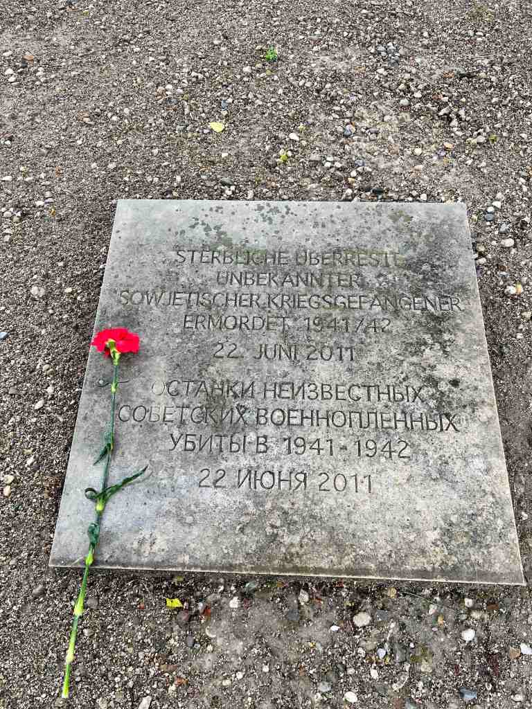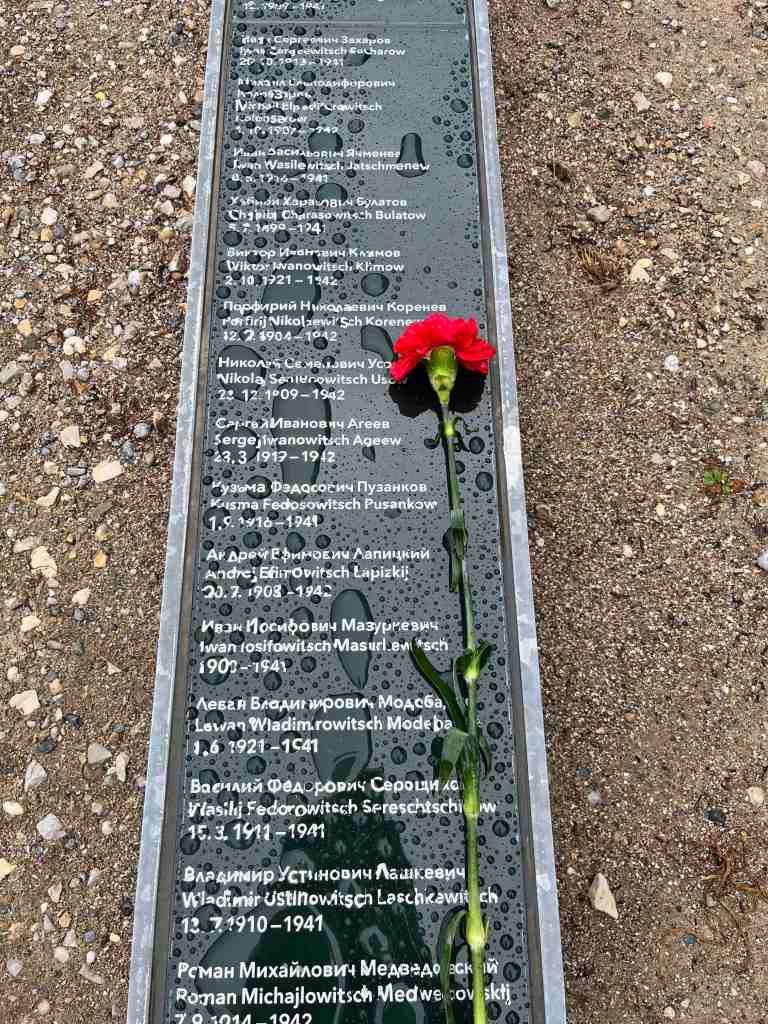 Diese Schmerzhaftigkeit der Erinnerung ist der Grund, warum es mit der Einrichtung der Gedenkstätte an solchen Orten wie hier so lange dauerte. Heute ist immer noch die Mehrzahl der Grabanlagen für sowjetische Opfer und ZwangsarbeiterInnen – wie auch der Lagerreste – mit Gras bewachsen, verwildert, am Rande der Städte und der gesellschaftlichen Wahrnehmung. Es waren zivilgesellschaftliche Initiativen, die gegen das Vergessen ankämpften und die Orte des Vergessens als Orte der politischen Gegenwartskritik, als Orte des Widerspruchs nutzten. In den 1990er Jahren konnte man zum ersten Mal die Stimmen der Opfer aus der ehemaligen Sowjetunion wahrnehmen, was zur Einsicht führte, dass die meisten Menschen zur Zwangsarbeit aus der Ukraine verschleppt wurden. Der Vermerk „besetzte Ostgebiete“ als Herkunftsort in den deutschen Arbeitsscheinen konnte von Historikern ausdifferenziert werden, auch wenn in der kollektiven Wahrnehmung eben vor allem Russland weiterhin als Referenz für den Krieg, seine Opfer und Sieger, blieb.