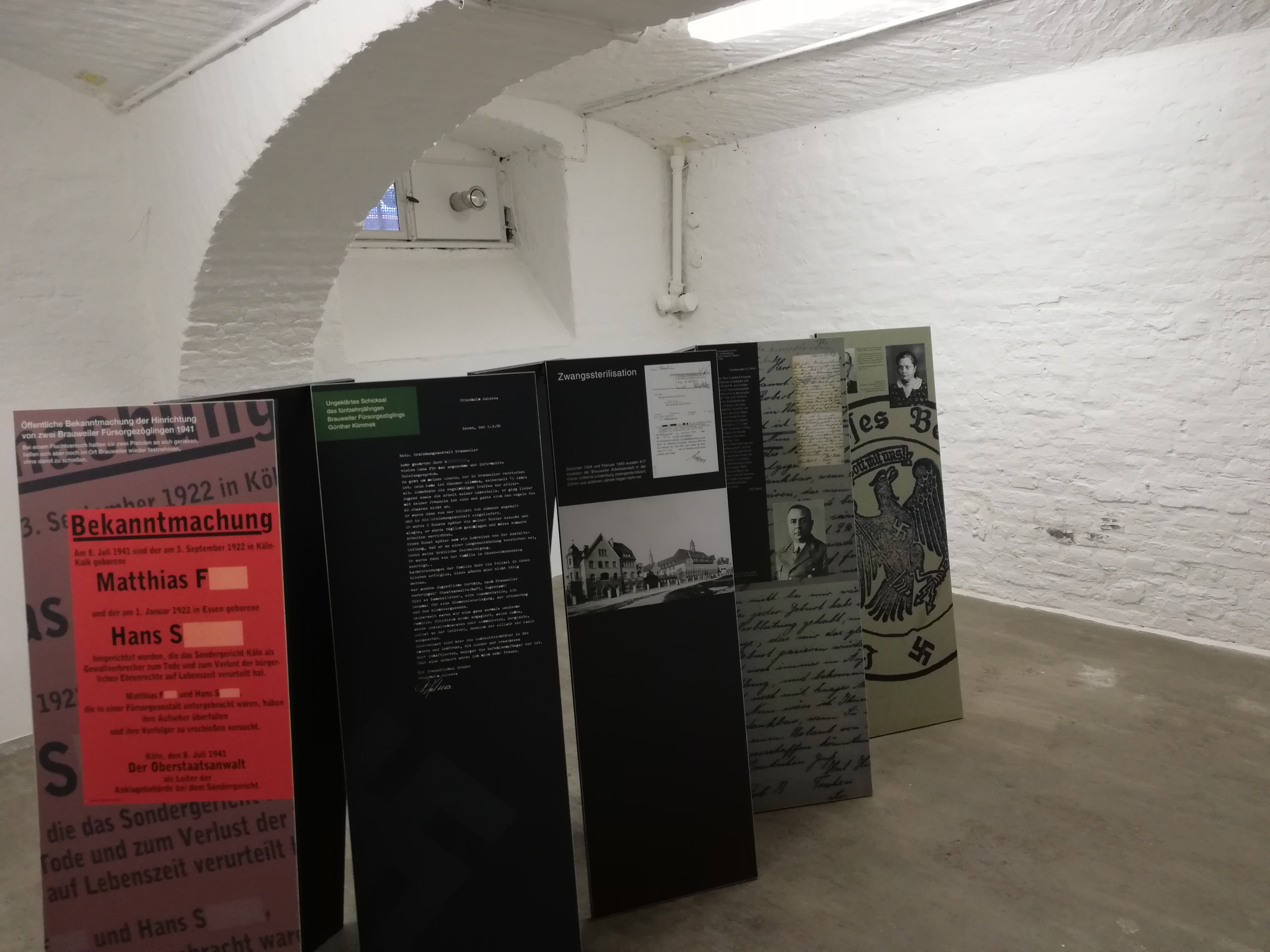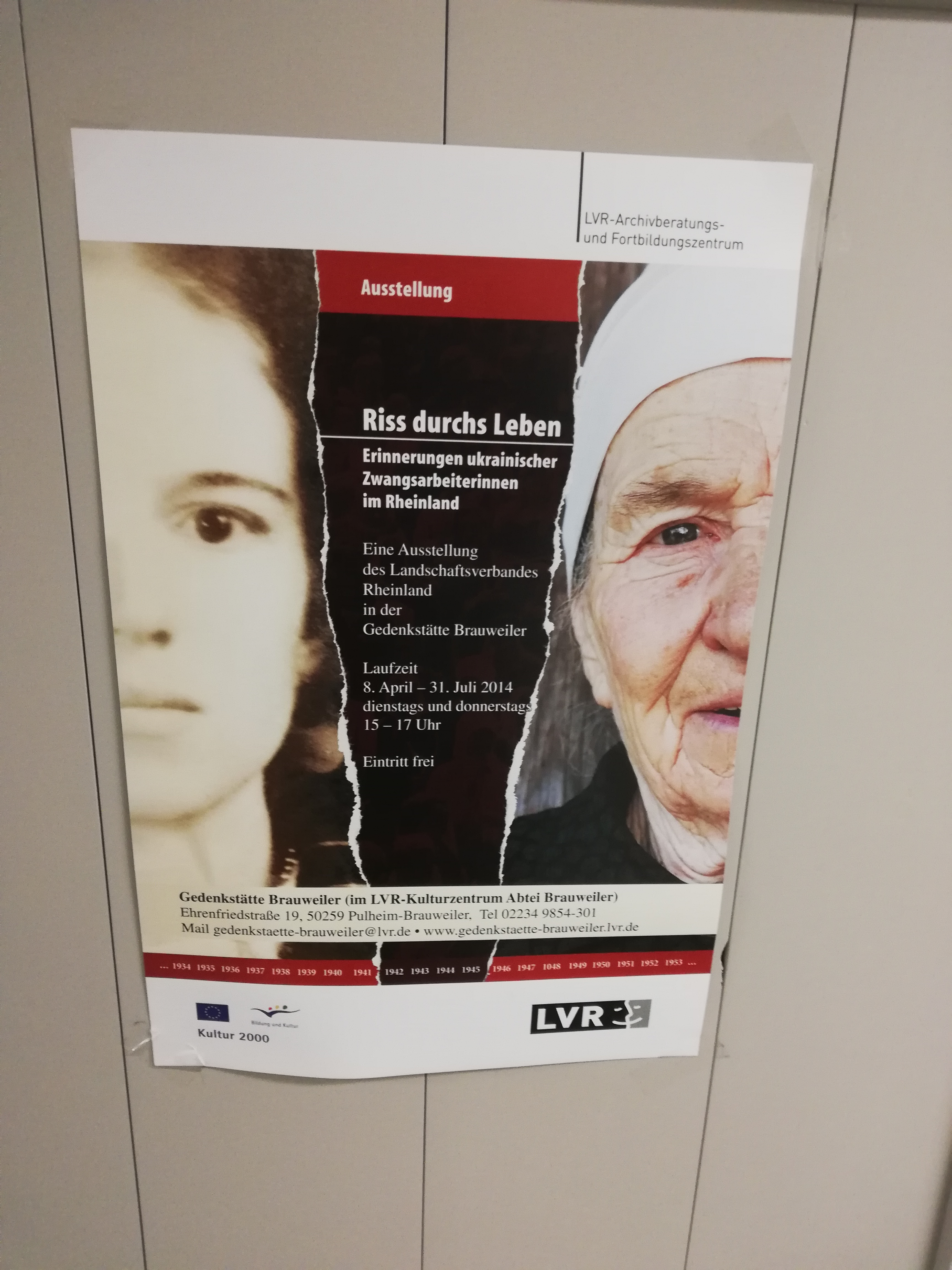 In den hinteren Räumen der Gedenkstätte befindet sich die Sonderausstellung „Riss durchs Leben. Erinnerungen ukrainischer Zwangsarbeiterinnen im Rheinland.“ Ursprünglich nur bis Ende Juli 2014 geplant, ist sie bis heute in den Ausstellungsräumen erhalten geblieben. Sie erzählt die Geschichte von zehn ukrainischen Frauen, die während des Krieges nach Deutschland verschleppt wurden und Zwangsarbeit leisten mussten. Besonders an dieser Ausstellung ist, dass sie fast ausschließlich die zehn Frauen zu Wort kommen lässt, die 2014 alle noch lebten und ihre Geschichte selbst erzählen konnten. Jedes einzelne Plakat erzählt die Geschichte ehemaliger Zwangsarbeiterin.