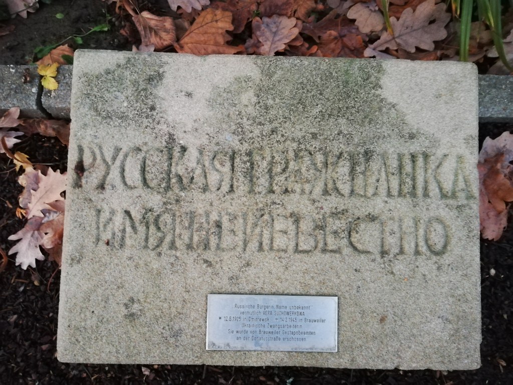 Auf dem Friedhof Brauweiler befindet sich eine Reihe an Gräbern aus der NS-Zeit. Ganz an ihrem Ende sind zwei unscheinbare Grabsteine mit der verwitterten Aufschrift in kyrillischen Buchstaben „Russische Bürgerin, Name unbekannt“. Vor einigen Jahren kamen kleine Metalltafel hinzu, die weitere Informationen über die vermeintlich anonymen Opfer liefern. Es handelt sich offenbar um letzte Opfer des NS-Terrors in Brauweiler: die beiden ukrainischen (und nicht russischen) Zwangsarbeiterinnen Nina Sawina und Vera Suchowerkowa wurden am 14. Februar 1945 hingerichtet, einen Tag bevor das Kütter-Kommando floh und nur wenige Tage vor der Befreiung durch die Amerikaner. Über Vera Suchowerkowa ist nur sehr wenig bekannt. Sie wurde am 20. September 1942 mit 16 Jahren aus der Ukraine nach Deutschland deportiert und arbeitete in einem Krankenhaus sowie einem Waisenhaus. Obwohl gegen Vera Suchowerkowa nachweislich keinerlei Anschuldigung vorlag wurde sie am 12. Oktober 1944 verhaftet und in Brauweiler inhaftiert.