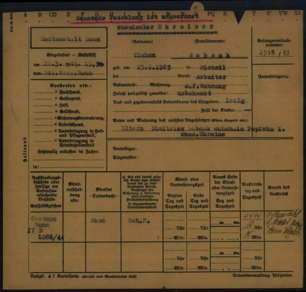 Haftanstalt Bonn, Karteikarte Tichon Sobcuk, Bonn, 1.1.2.5/ 3625000/ ITS Digital Archiv, Arolsen Archives