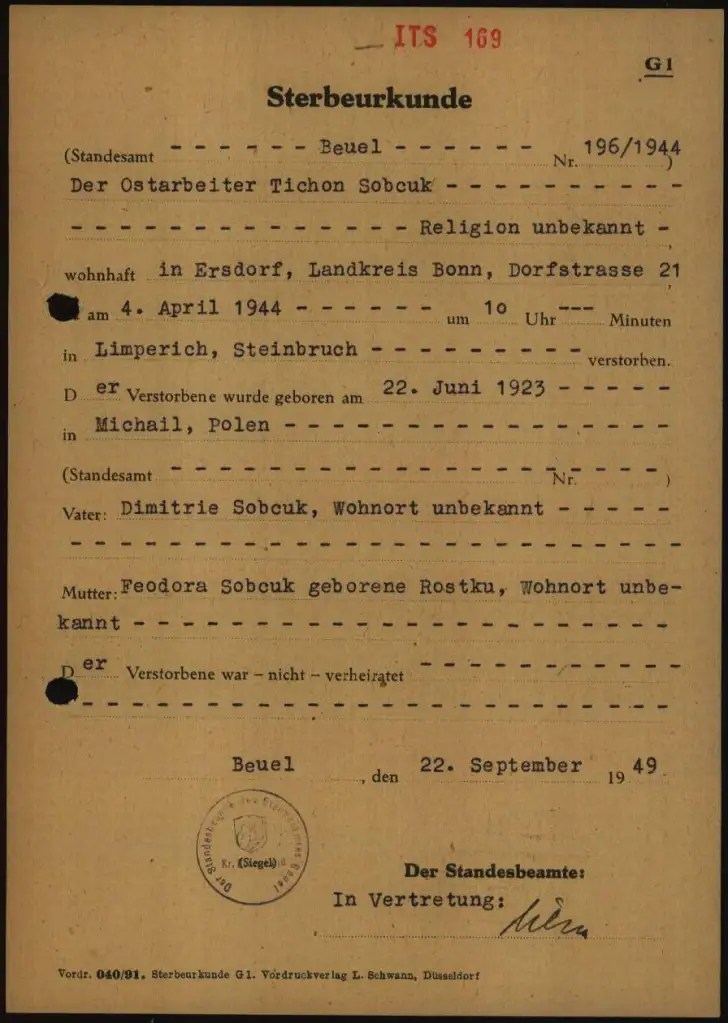 Sterbeurkunde Tichon Sobcuk, Bonn-Beuel, 2.2.2.2/ 02020202 oS/ ITS Digital Archiv, Arolsen Archives.