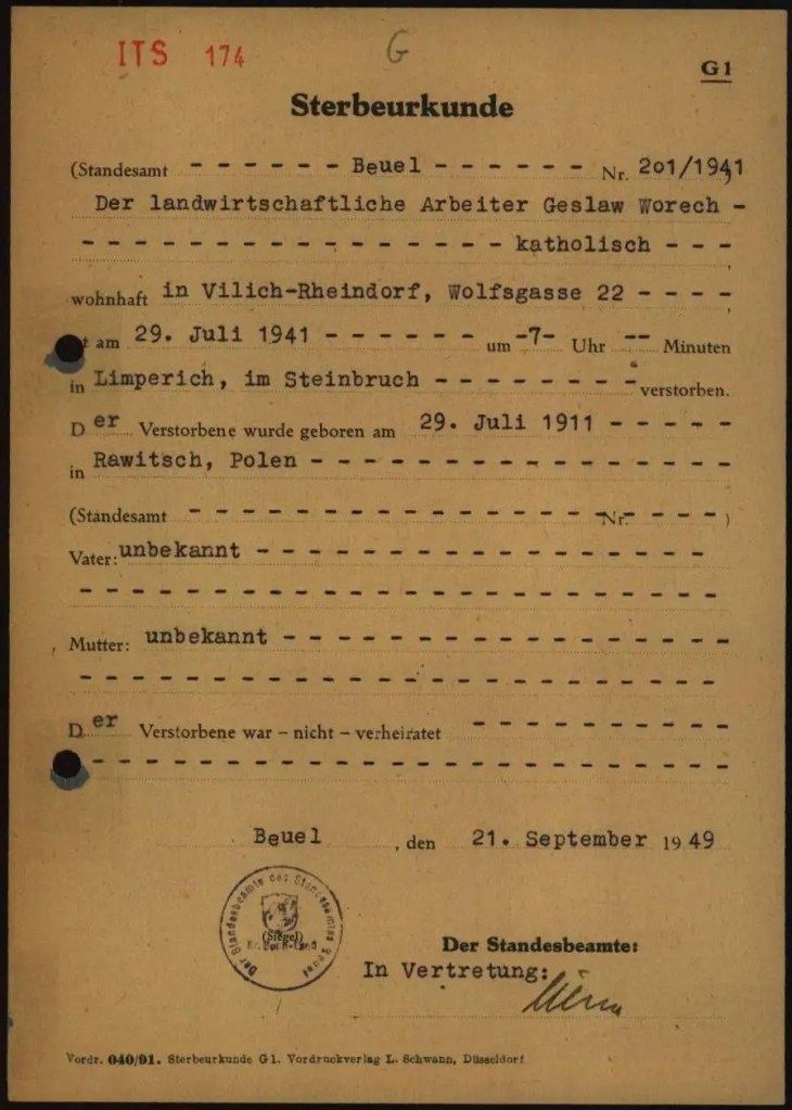 Sterbeurkunde Geslaw Woroch, Bonn-Beuel, 2.2.2.2/ 02020202 oS/ ITS Digital Archiv, Arolsen Archives.