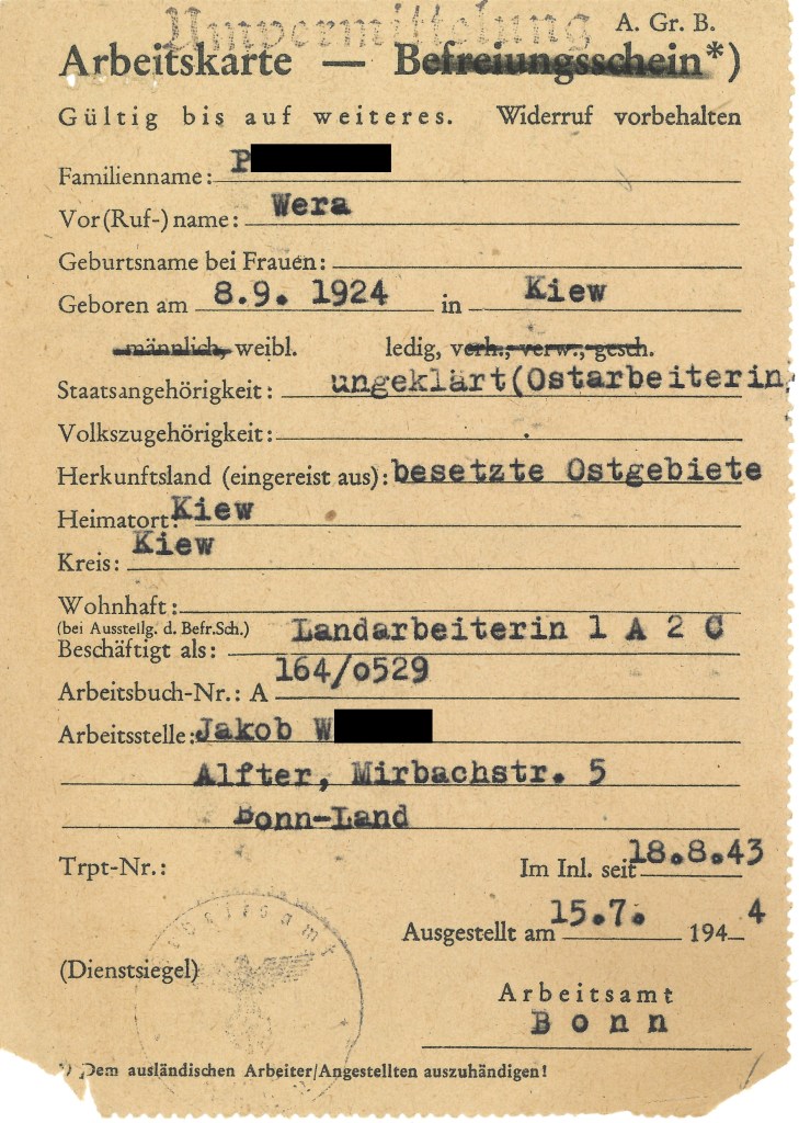 Wera P. musste ursprünglich bei einem Gielsdorfer Landwirt arbeiten, kam dann zu einem Bauern nach Hersel. Hochschwanger wurde Sie wenige Wochen vor der Geburt ihres Sohnes zu einem Alfterer Landwirt „umvermittelt“.
