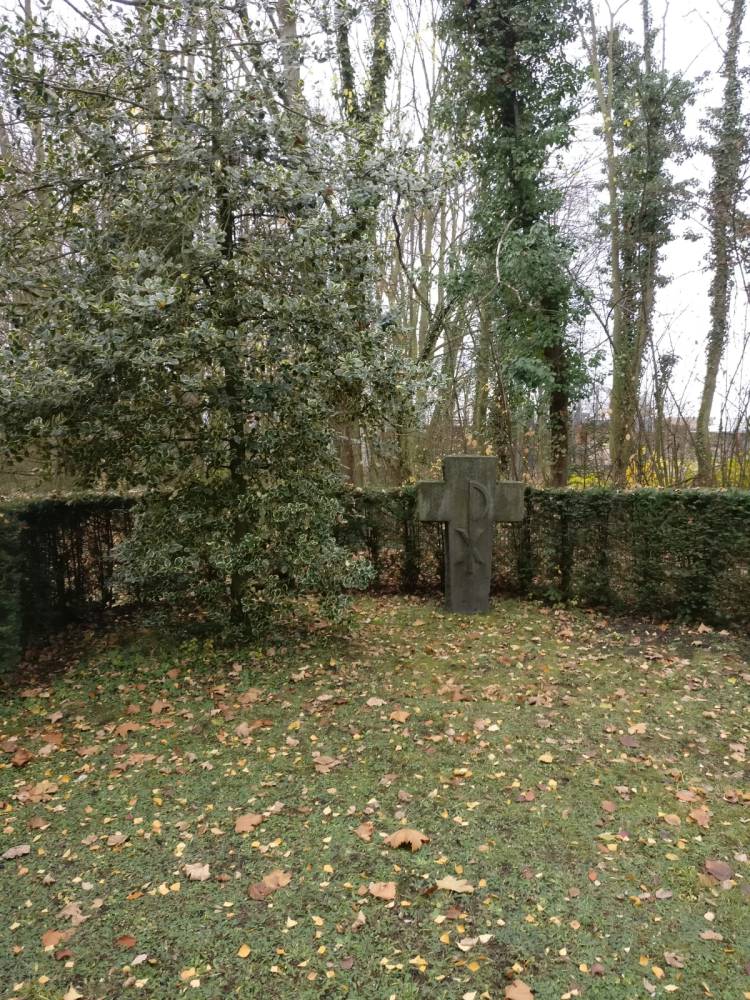 Vor dem Grabstein befindet sich ein Schild mit der wörtlichen Übersetzung der russischen Inschrift, jedoch fehlte diese Informationstafel zur Zeit meines Besuches (November 2019), sodass man die Bedeutung des Ehrenmals nur durch den Hinweis auf der Informationstafel am Eingangstor und durch den roten Stern, der oft als Symbol für die sozialistische bzw. kommunistische Weltanschauung wahrgenommen wird, erahnen kann, wenn man kein russisch sprechen oder verstehen kann. Der Stein wurde unmittelbar nach Ende des Zweiten Weltkrieges 1945 auf Bestreben der Alliierten am Ort des Verbrechens (Knapsacker Werke) aufgestellt und seine Pflege, für die ebenfalls die Stadt Hürth verantwortlich ist, bis heute von dem russischen Konsulat in Bonn begrüßt.7 Der Grabstein wirkt sehr gepflegt, gut erhalten und lesbar. Es befand sich zur Zeit der Objektsicherung eine Grabkerze und eine Gießkanne zur Bewässerung der umliegenden Pflanzen an dem Grab und es lag ein Kranz der Ortsgemeinde Alt-Hürth mit der Aufschrift „In stillem Gedenken“ unmittelbar vor dem Stein. Besonders interessant ist, dass sich innerhalb der quadratischen Rasenfläche ungefähr zehn Meter links von dem Grabstein mit dem roten Stern ein Steinkreuz befindet, welches ebenfalls zur Anlage gehört. Dieses trägt das Christusmonogramm, wobei es sich um die ersten beiden Buchstaben des griechischen Wortes Christós (Christus) handelt. Nach dem Kreuz und dem Fisch ist es das am häufigsten anzutreffende Symbol für Jesus Christus. Dieses Steinkreuz wurde im Jahre 1961 auf Wunsch der Einwohner von Knapsack mit Unterstützung des Gemeindepfarrers Krings errichtet. Das Ziel war, einen Ort des Gedenkens an die Opfer der Zwangsarbeit für die deutsche Bevölkerung zu gestalten.8 Während sich der Grabstein mit dem roten Stern also hauptsächlich an die Menschen aus Russland richtet (klar ersichtlich durch Initiator der Aufstellung, Inschrift und Formulierung), steht ein separates, christlich geprägtes Symbol als Ort für das Gedenken auf der lokalen Ebene.