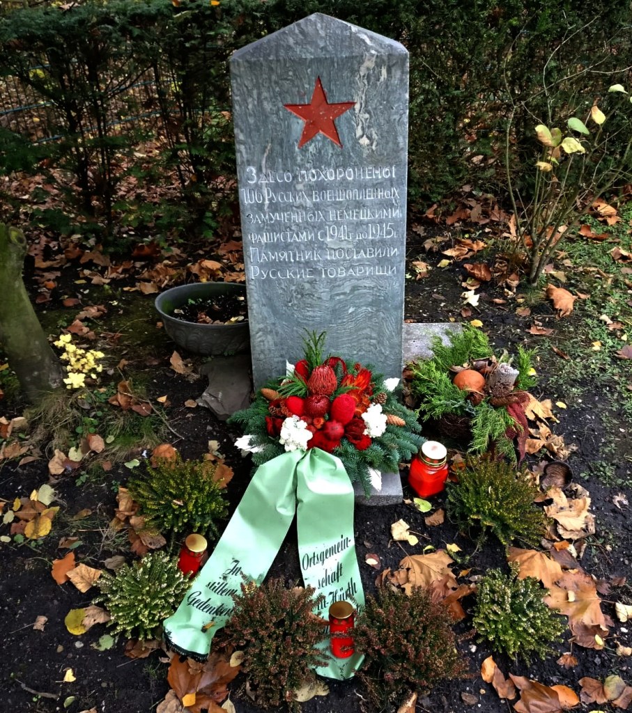 Die Zeilen informieren darüber, dass an diesem Ort 106 russische Kriegsgefangene ruhen, die „von 1941 bis 1945 durch deutsche Faschisten zu Tode gequält wurden“ und dass „das Denkmal von russischen Kameraden aufgestellt“6 wurde. Es ist der gleiche Stein wie auf dem Friedhof in Wesseling Berzdorf-Sternenstraße, an dem drei sowjetische Zwangsarbeiter beigesetzt wurden. Hyperlink Text Wesseling Offenbar wurde es nach dem Krieg von denselben Menschen in Auftrag gegeben und von demselben Steinmetz angefertigt. Auch die Inschrift ist die gleiche – mit Ausnahme der Zahl der hier beigesetzten „russischen Kriegsgefangenen“.
