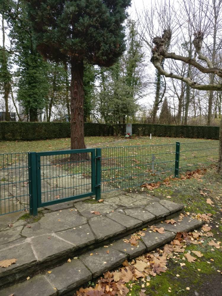 Von besonderer Bedeutung ist das Sammelgrab für 106 sowjetische Kriegsgefangene und Zwangsarbeiter: An diesem Ort sind also die meisten Kriegsgefangenen des Rhein-Erft-Kreises beerdigt.5 Es befindet sich ganz am Ende des geradlinigen Hauptweges, ist durch einen kleinen Zaun umgrenzt und durch ein offenes Tor begehbar. Der Grabstein befindet sich auf einer quadratischen Rasenfläche mit gepflasterten Weg. Oben auf dem Stein ist ein mit roter Farbe ausgefüllter Stern und darunter eine Inschrift auf Russisch, die ursprünglich ebenfalls rot ausgefüllt war, doch mit der Zeit ihre Farbe verloren hat: