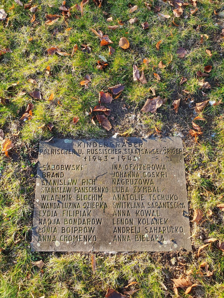 Das Feld besteht aus 40 Grabplatten auf denen verschieden vollständige biographische Angaben über die gestorbenen Zwangsarbeiter und Zwangsarbeiterinnen gemacht wurden. Die vollständigsten Platten beinhalten sowohl Vor- als auch Nachnamen der Gestorbenen sowie ihr Geburts- und Sterbejahr. Bei einigen Platten fehlen allerdings entweder der Vorname oder das Geburtsjahr, in einem Fall ist auch das Sterbejahr unbekannt. Zusätzlich gibt es eine Platte mit Namen von 20 russischen und polnischen Kindern, die dort ebenfalls begraben wurden. Jahre von Geburt und Tod sind für sie nicht vermerkt. Dabei werden alle sowjetischen Kinder als „russisch“ bezeichnet, obwohl ein großer Teil der sowjetischen Kinder eigentlich ukrainisch waren. Diese „Russifizierung“ der sowjetischen Opfer tritt bei Gedenkorten in Deutschland häufig auf. Alle Platten sind in den Boden eingelassen, obwohl dies eine neuere Entwicklung ist. Ursprünglich standen sie ein Stück aus dem Boden hervor. Vermutlich wurde dies aber geändert, um das Mähen der Rasenfläche zu ermöglichen.58 Sie werden vom Friedhof selber nicht oder nur wenig gepflegt, manche Platten sind leicht überwuchert und auf einigen lässt sich die Schrift kaum noch entziffern. Der einzige Name, zu dem mehr bekannt ist, ist der von Jadwiga Pawlowska (auf dem Gräberfeld als Jadwik Bawlocka begraben).