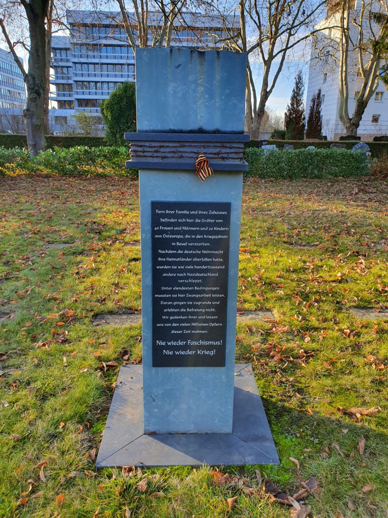 „Fern ihrer Familie und ihres Zuhauses befinden sich hier die Gräber von 40 Frauen und Männern und 20 Kindern auf Osteuropa, die in den Kriegsjahren in Beuel verstarben. Nachdem die deutsche Wehrmacht ihre Heimatländer überfallen hatte, wurden sie, wie viele hunderttausend andere nach Nazideutschland verschleppt. Unter elendesten Bedingungen mussten sie hier Zwangsarbeit leisten. Daran gingen sie zugrunde und erlebten die Befreiung nicht. Wir gedenken ihrer und lassen uns von den vielen Millionen Opfern dieser Zeit mahnen: Nie wieder Faschismus! Nie wieder Krieg!„