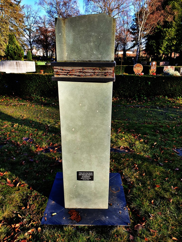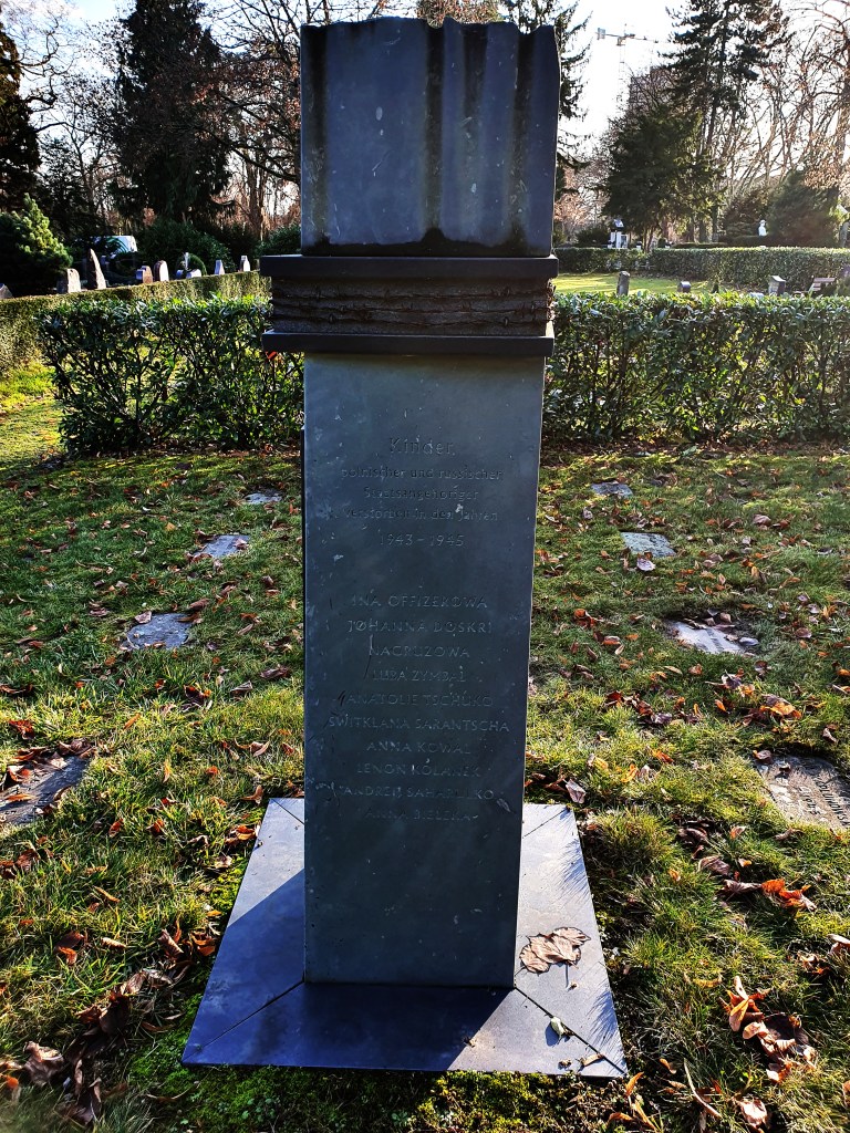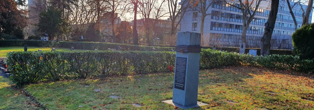 Gedenkstele und Gräberfelder für Zwangsarbeiter auf dem Friedhof Platanenweg in Bonn-Beuel