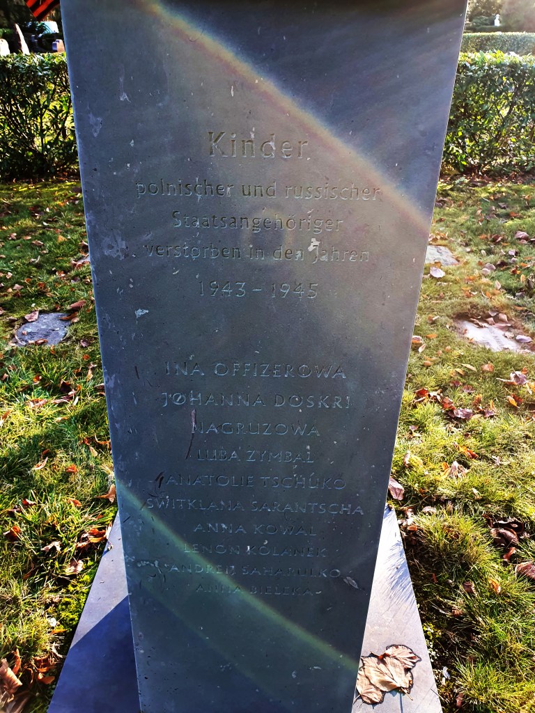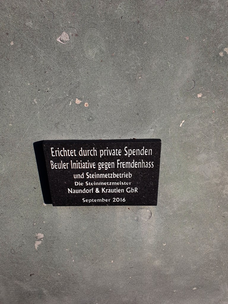 Auf der linken und rechten Seite sind je 10 der Kindernamen von der Platte im Boden vermerkt, auf der Rückseite befindet sich klein eine Information zum Hintergrund der Stele. Sie geht auf das Engagement der „Beueler Initiative gegen Fremdenhass“ zurück und wurde durch Spenden finanziert.