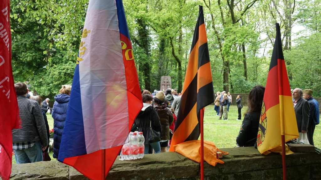 2019 feierten die Mitglieder des Vereins „Gedenken e.V. (Pamjatj) e. V.“ den 9. Mai am Sowjetischen Ehrenfriedhof in Düsseldorf. Hinten: die Sowjetische Kriegsgräberstätte „Am Gallberg“