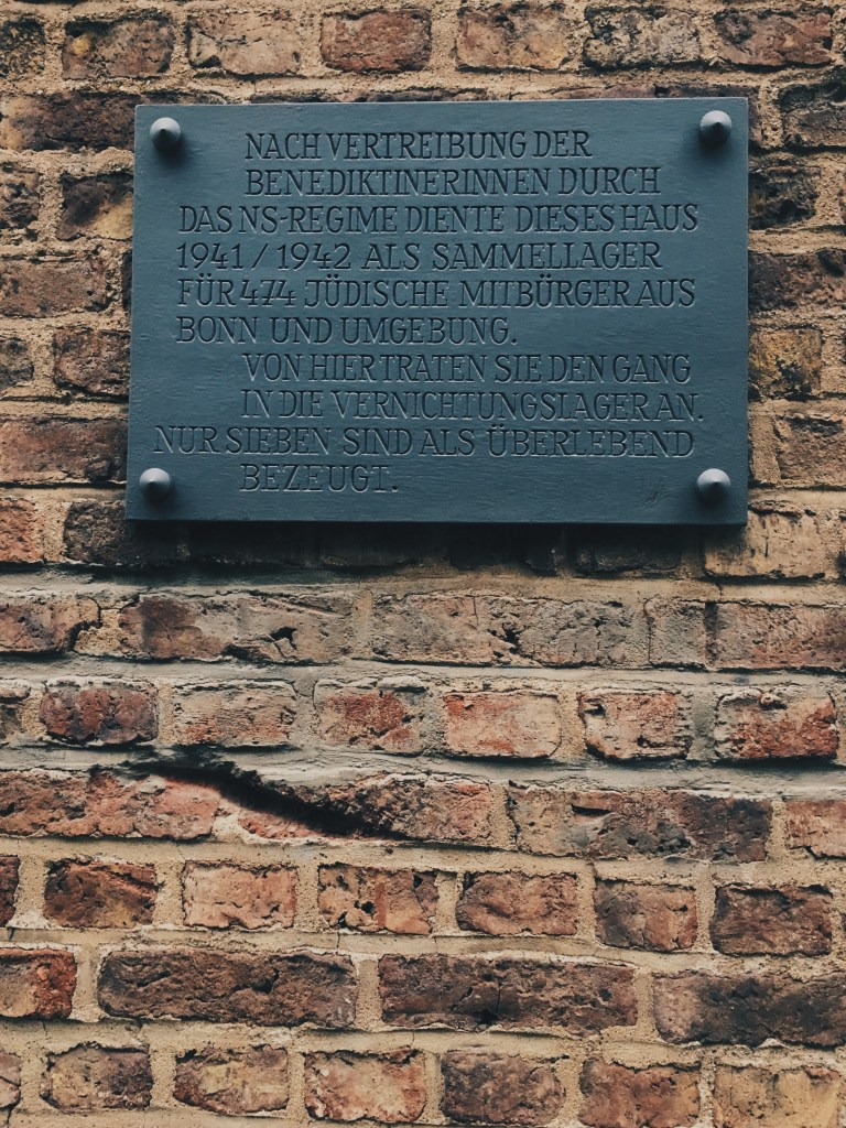 „Nach Vertreibung der Benediktinerinnen durch das NS-Regime diente dieses Haus 1941/1942 als Sammellager für 474 jüdische Mitbürger aus Bonn und Umgebung. Von hier traten sie den Gang in die Vernichtungslager an. Nur sieben sind als überlebend bezeugt.“