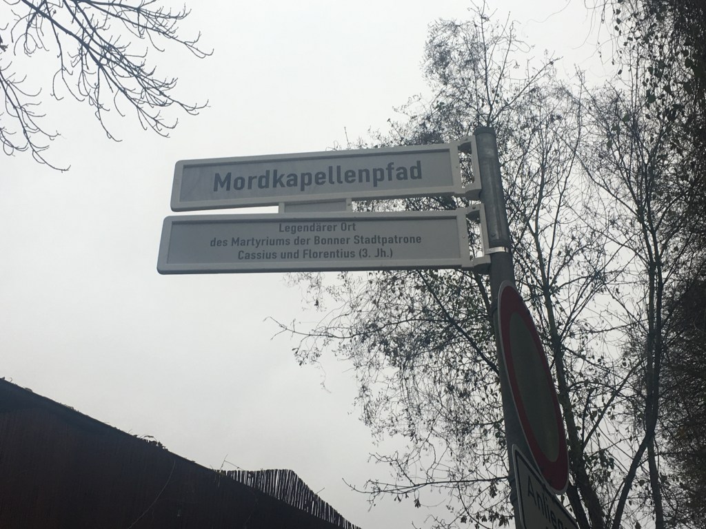 Blickt man von der Marterkapelle aus zum Waldweg Richtung Kreuzberg, so sieht man ein Straßenschild, was dort hinzeigt. „Mordkapellenpfad — Legendärer Ort des Martyriums der Bonner Stadtpatrone Cassius und Florentinus (3. Jh.)“, heißt es auf dem Straßenschild. Rundherum und den Weg entlang findet sich ein Stationsweg mit mehreren Andachtsstationen für den Passionsweg Christi.