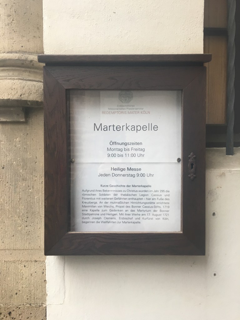 „Aufgrund ihres Bekenntnisses zu Christus wurden im Jahr 295 die römischen Soldaten der thebäischen Legion Cassius und Florentinus mit weiteren Gefährten enthauptet — hier am Fuße des Kreuzbergs. An der mutmaßlichen Hinrichtungsstätte errichtete Maximilian von Weichs, Propst des Bonner Cassius-Stifts, 1719 eine Kapelle zum Gedenken an das Martyrium der Bonner Stadtpatrone und Heiligen. Mit ihrer Weihe am 17. August 1721 durch Joseph Clemens, Erzbischof und Kurfürst von Köln, begannen die Wallfahrten zur Marterkapelle.“