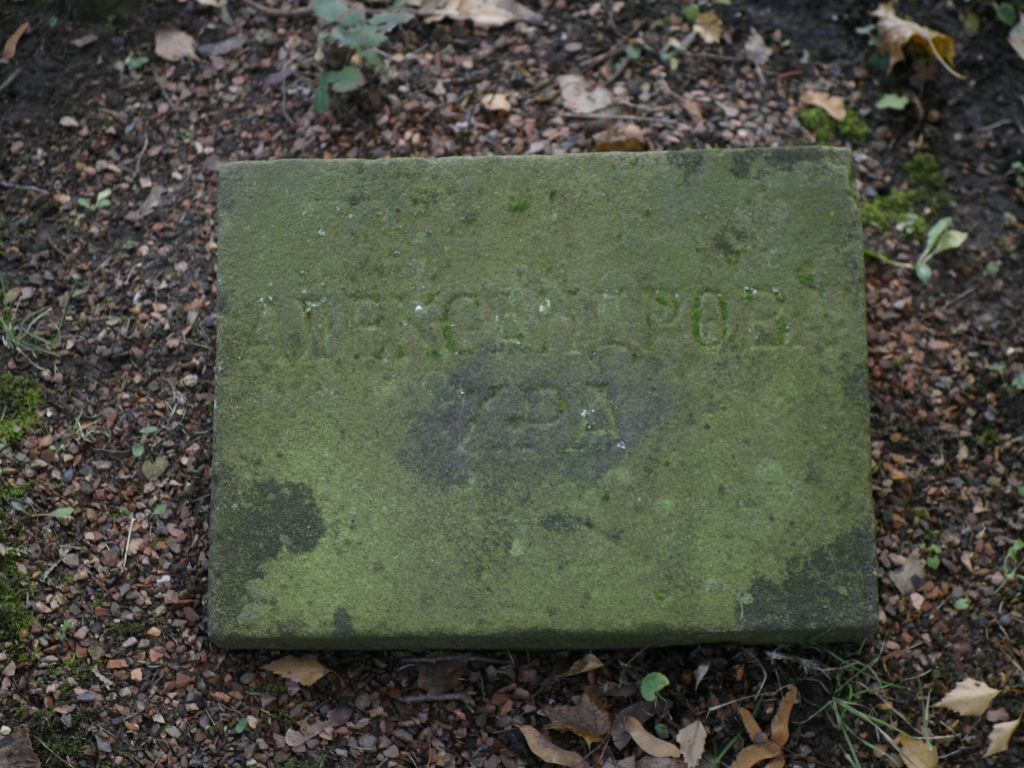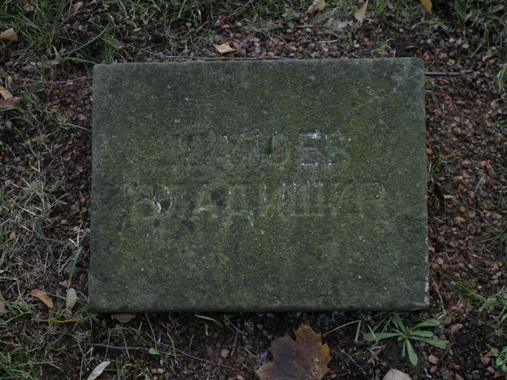 Unbekannter Ostarbeiter: Es gibt es eine zweite Grabplatte, die einen Namen trägt, den man in den beiden bereits oft erwähnten Listen vom Friedhofsamt und im Aufsatz von Hesse und Purpus nicht verzeichnet ist. Die Grabplatte selbst ist stark verwittert und mit Moos bedeckt. Es dürfte sich um die Grabplatte von ШАЛОБЕ ВЛАДИМИР (Wladimir Schalobe) handeln. Über ihn könnte die Recherchearbeit aber keine weiteren Informationen liefern.