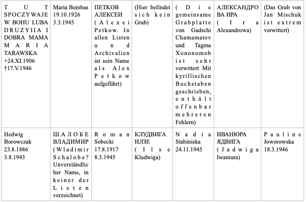 Zwei Grabsteine fallen besonders auf. Der erste ist eine etwas größere Grabplatte (von Jan Mischuk), extrem verwittert, so dass nur wenige Buchstaben und einzelne Nummern in der Inschrift zu entziffern sind. Auf der linken Seite ist ein Kreuz eingemeißelt, ebenfalls ein Merkmal, das auf den anderen Grabplatten fehlt. Der andere (von Maria Tarawska) scheint auf dem ersten Blick in keinem direkten Verhältnis zu den anderen zu stehen: Ein ungefähr ein Meter hoher Grabstein mit einer längeren Inschrift. Die Recherche hat ergeben, dass es sich mit großer Wahrscheinlichkeit auch in diesem Fall um Grabstein einer Zwangsarbeiterin handelt.16