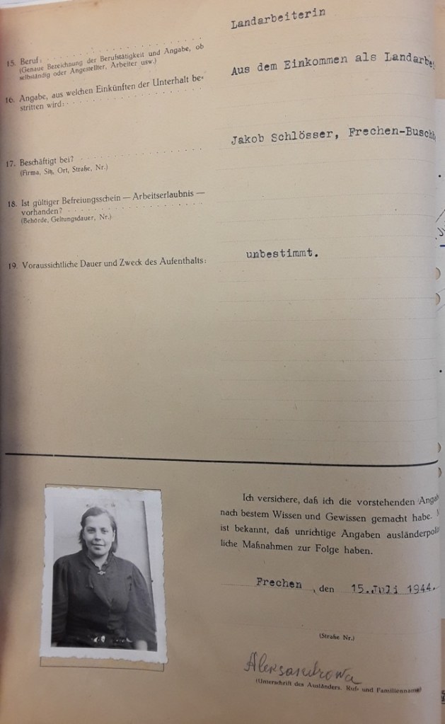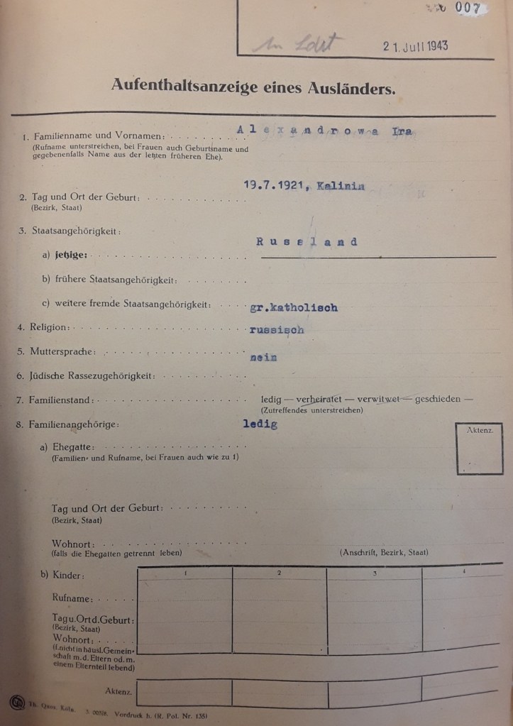ALEXANDROWA, Ira: Ihr Leben endete auf tragische Weise. Am 30. Januar 1945 wählte sie den Freitod, wie mehrere Dokumente im Stadtarchiv Frechen bezeugen. Dabei heißt es in einem Schreiben des „Bürgermeister als Ortspolizeibehörde Ausländeramt“ vom 3. Februar 1945 in Frechen, das „an dem Herrn Landrat in Brühl“ gerichtet war: „Laut Bericht der Polizeileitestelle Köln, außenposten Frechen, hat die bei Jakob Schlösser, Buschbell, beschäftigte Ostarbeiterin Ira Alexandrowa, geb. am 19. Juli 1921 in Kalinin, am 30. Januar 1945 durch trinken von Essig-Essenz Selbstmord begangen.“19 Weitere Informationen liefert ein Schreiben der Kriminalpolizeileitstelle Köln an das Einwohnermeldeamt Frechen, wo man u. a. lesen kann, dass sie im „Obstgut Schlösser in Frechen-Buschbell“ gearbeitet habe und dass „Angehörige (…) hier nicht festgestellt werden […].“20 konnten. Sie war, wie auch ein weiteres Dokument vom 15. Juli 1944 mit dem Titel „Aufenthaltsanzeige eines Ausländers“ bezeugt,21 als Landarbeiterin dort tätig. Sie war ledig und griechisch-katholischen Glaubens. Seit dem 7. August 1942 befand sie sich in Frechen-Buschbell.22 Dieses Aktenstück trägt zudem Ira Alexandrowas eigenhändige Unterschrift sowie ihr Lichtbild.23 Es handelt sich dabei um das einzige Lichtbild von einer den in Frechen-Bachem beigesetzten ZwangsarbeiterInnen, das die Spurensuche im Stadtarchiv Frechen ergeben hat.