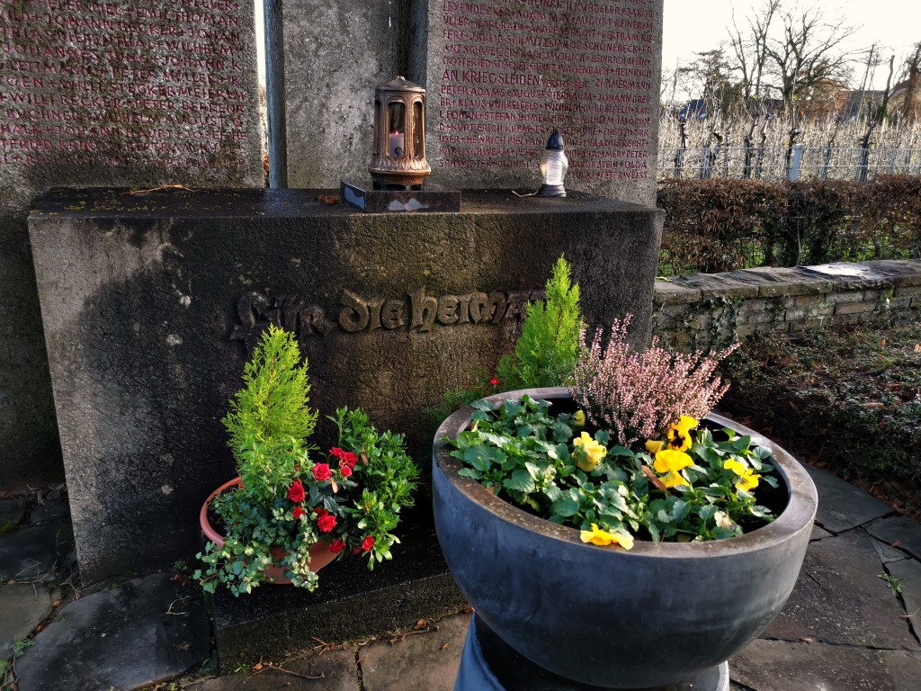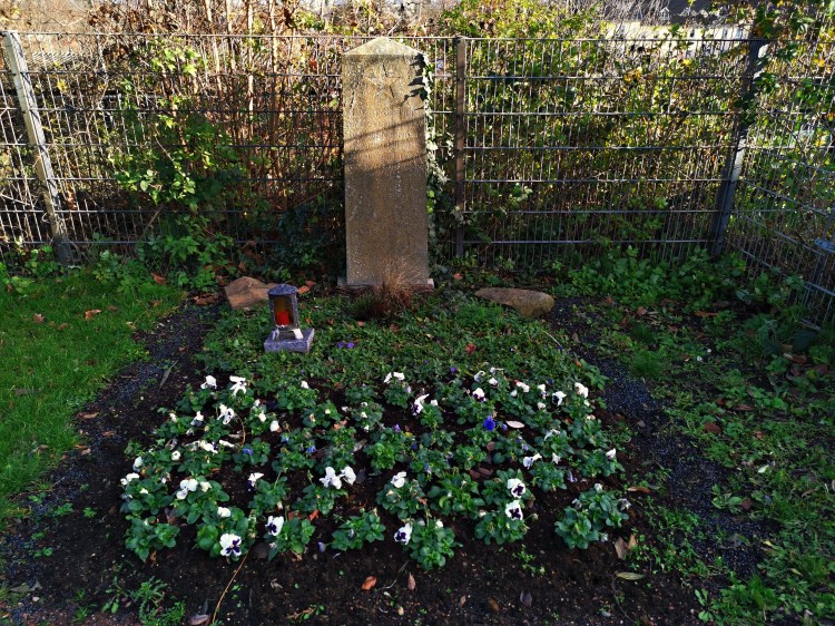 Die Inschrift war ursprünglich, ebenso wie der Stern, in roter Farbe geziert, welche allerdings im Verlauf der Zeit abgeblättert ist.2 Der Text der Inschrift ist nicht ungewöhnlich: Im gleichen oder ähnlichen Wortlaut sind die Inschriften auf den anderen Grabmalen für die sowjetischen Kriegsgefangenen oder Zwangsarbeitern verfasst. Man sieht hier eine historische Ungenauigkeit: die Daten 1941-1945 stehen für den gesamten Dauer des „Großen Vaterländischen Krieges“, sie beziehen sich nicht auf die tatsächliche Dauer der Inhaftierung im Lager; als Täter werden anonyme „deutsche Faschisten“ genannt – was der zeitgenössischen sowjetischen Rhetorik entspricht; als Objekten des Gedenkens – russische Gefangene, wobei deren tatsächliche Nationalität (Russen? Ukrainer? Belorussen?) verborgen bleibt. Es scheint, dass dieser Stein zunächst als Provisorium errichtet wurde, um lediglich die letzte Ruhestätte zu markieren. Die Inschrift ist im fehlerhaften Russisch: Der Grabstein wurde wahrscheinlich in Hektik geschaffen – es ließen sich kein Steinmetz und kein Datum der Aufstellung feststellen – um später einem „richtigen“ Denkmal Platz zu machen. Doch dazu ist es nie gekommen. Bis heute ist die Funktion des „Erinnerungsortes“ die gleiche geblieben, wie ursprünglich: es ist ein Grabmal, keine „Gedenk“-Stätte. Abgesehen von den kirchlichen Ritualen finden hier keine Gedenkpraktiken statt. Auch in der Online-Präsenz der Stadt Wesseling3 wird lediglich auf die katholische Kirche „Schmerzhafte Mutter“ und ihre Geschichte verwiesen, das Grab der Kriegsgefangenen wird nicht erwähnt. Der Grabstein befindet sich im Allgemeinen in einem gepflegten Zustand, es hat die typischen sepukralen Attribute wie eine kleine Bepflanzung und eine Grablaterne. Für die Pflege kommt die Stadt Wesseling auf.4
