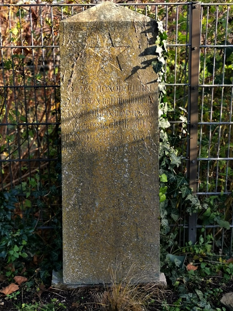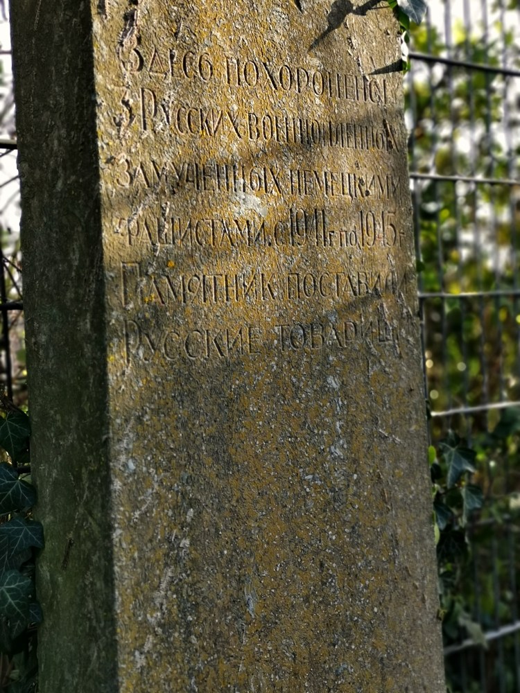 «Здесь похоронены 3 русских военнопленных замученных немецкими фашистами с 1941 по 1945 год. Памятник поставили русские товарищи.»1